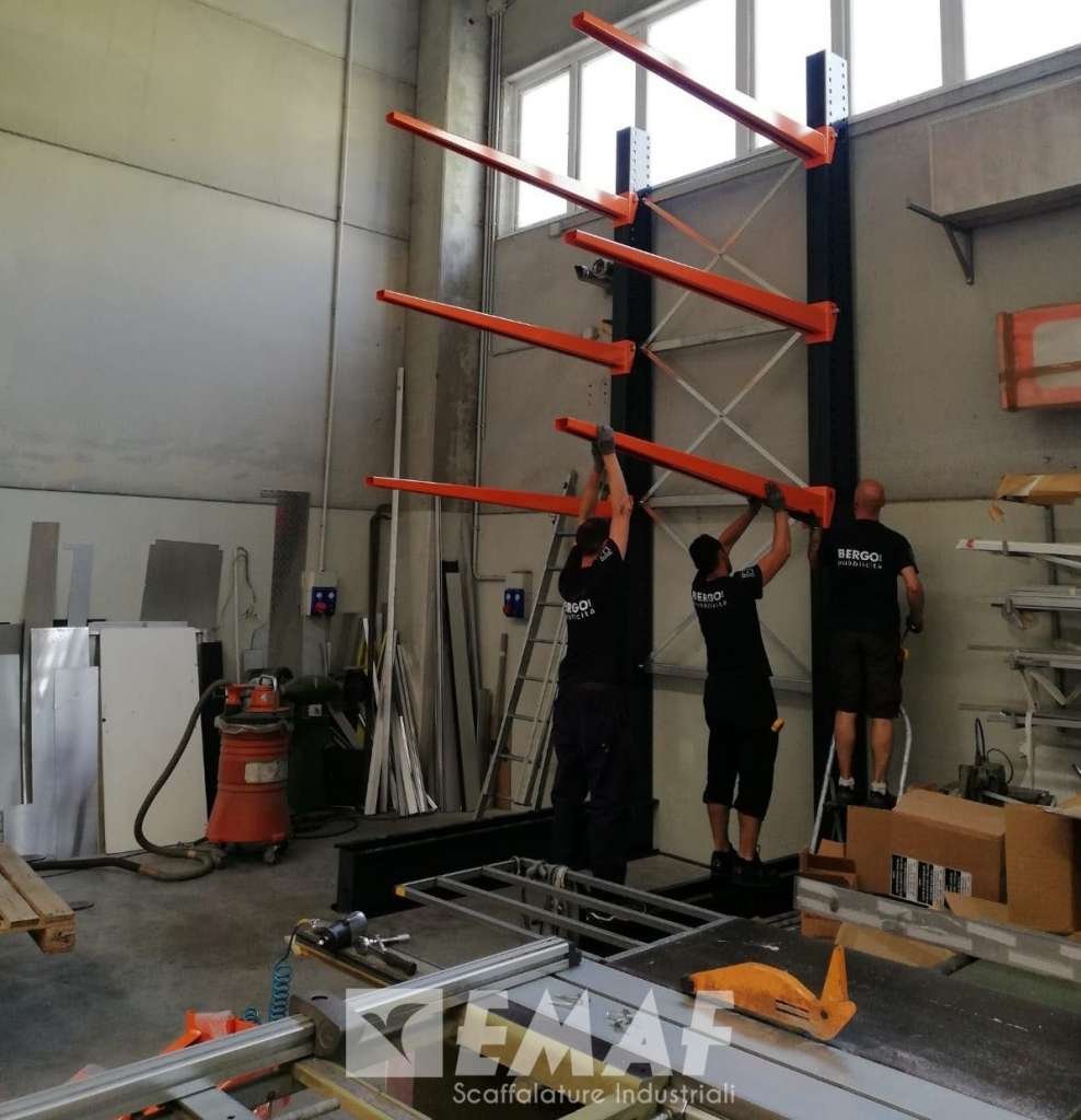 Nuova scaffalatura Cantilever modello Mantegna installata a Ponte San Nicolò da Emaf presso la Bergo Snc, importante realtà produttrice di insegne pubblicitarie e segnaletica stradale.