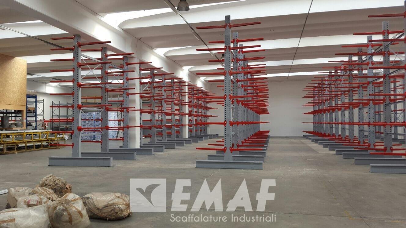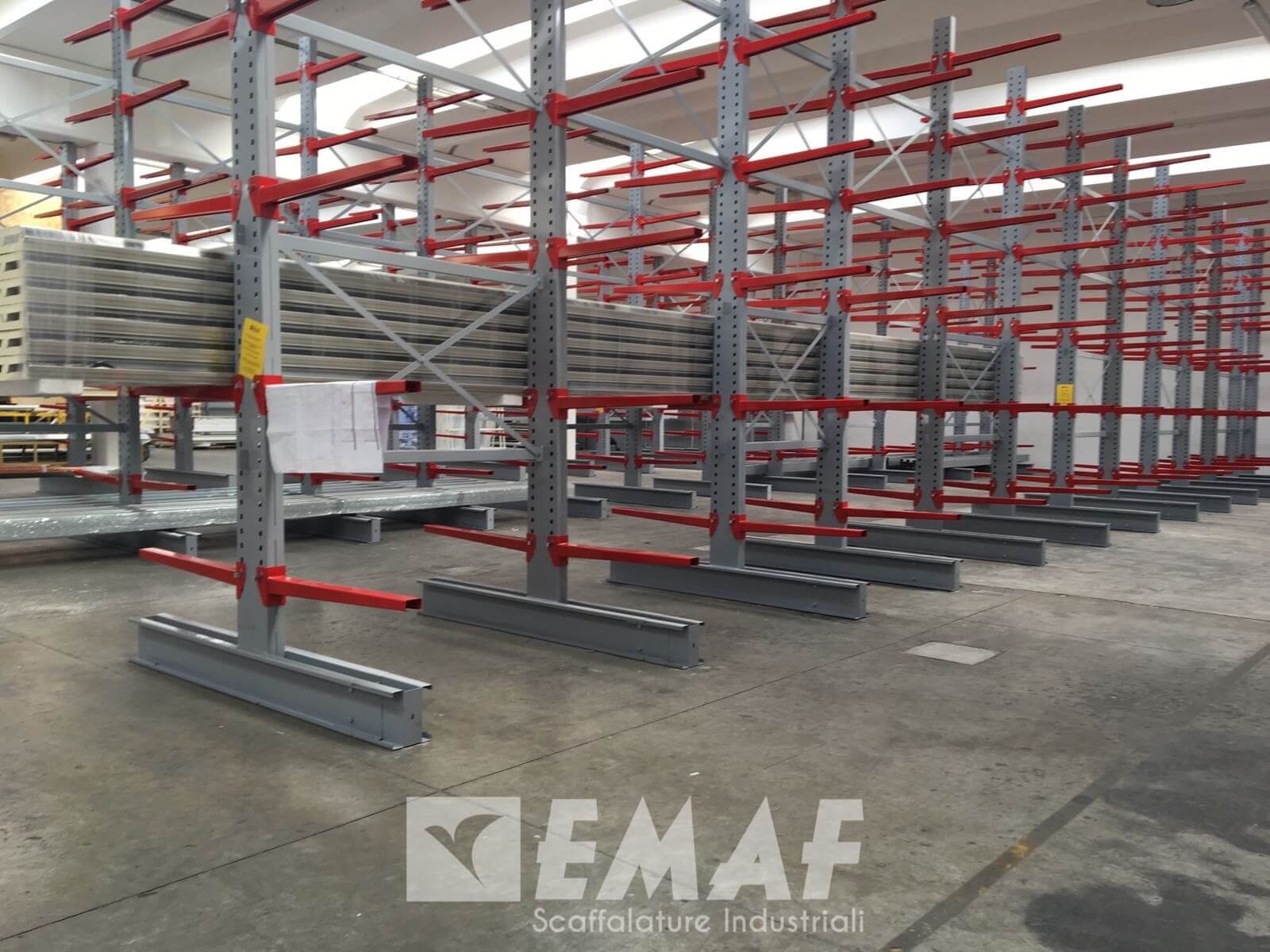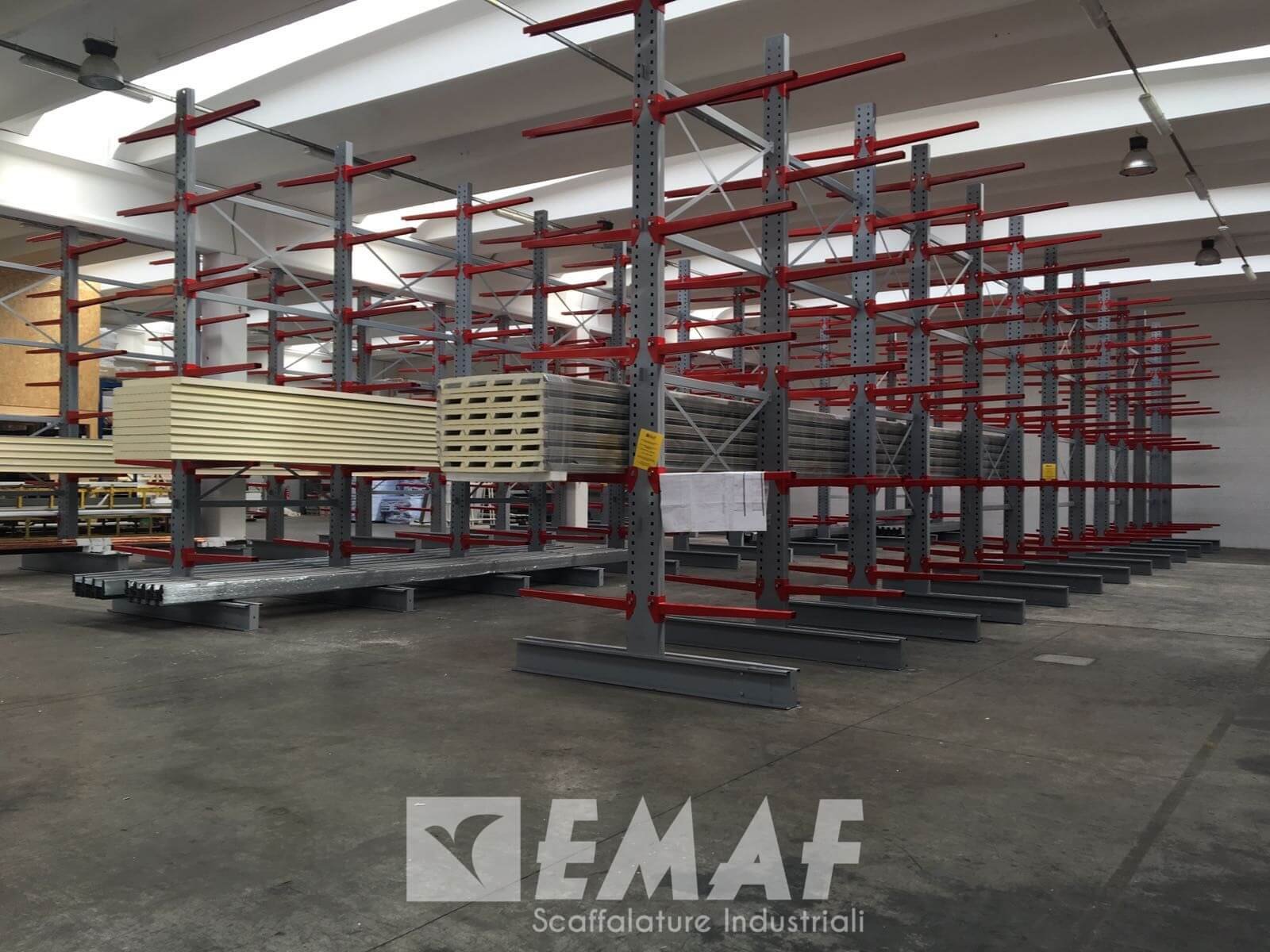 Un cantilever alto in media 5 metri e 60, con mensole di portata di 240 chili da 1100, 1400 e 2000 millimetri conserva già pannelli coibentati e lamiere zincate per la produzione di impianti frigoriferi di primissima qualità.