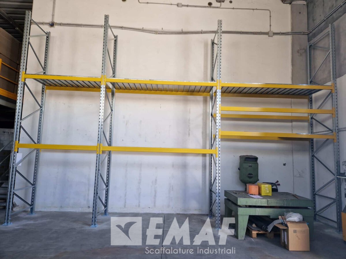 Le strutture sono state saldamente fissate al suolo tramite una piastra base rinforzata, progettata per entrare all’interno del montante stesso, assicurando una stabilità superiore e una maggiore sicurezza operativa. Questo dettaglio tecnico riflette l’attenzione meticolosa di Emaf Scaffalature Industriali alla qualità e all’affidabilità delle proprie installazioni.