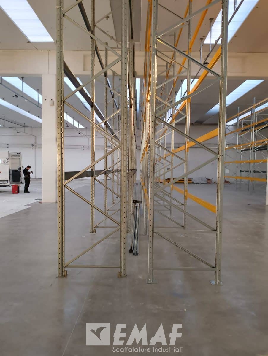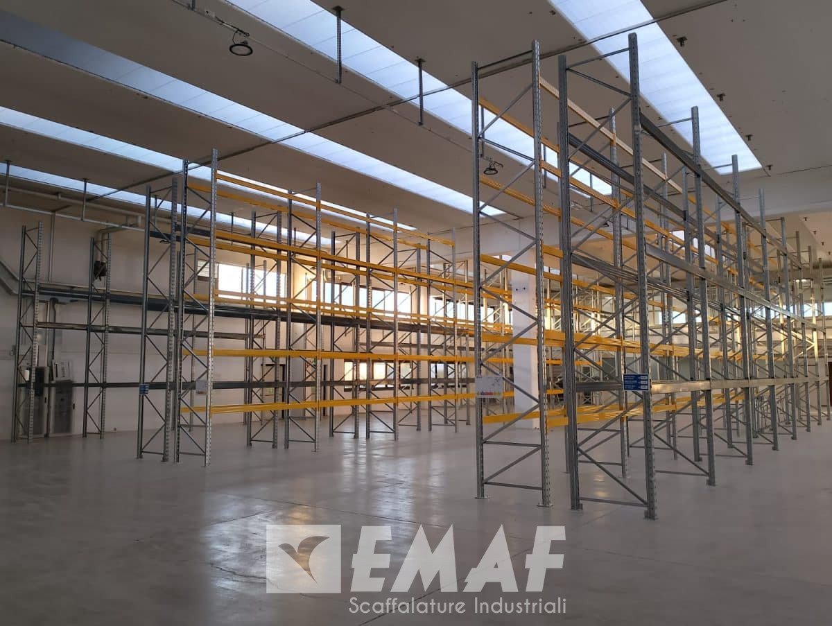 Passando alla sezione dedicata ai portapallet nuovi, la scelta di Emaf per il modello EM100 Giotto ha dimostrato di essere la soluzione ideale. Le spalle zincate e le correnti gialle non solo conferiscono un tocco di freschezza al magazzino, ma testimoniano anche la qualità e la durabilità del sistema. Con 18 spalle di 6000 x 1000 mm e 160 correnti lunghe 2700 mm, sono state realizzate 16 campate, ognuna con 5 livelli e il piano terra, offrendo una capacità di stoccaggio di 288 pallet, anch’essi con una capacità massima di 500 kg ciascuno.