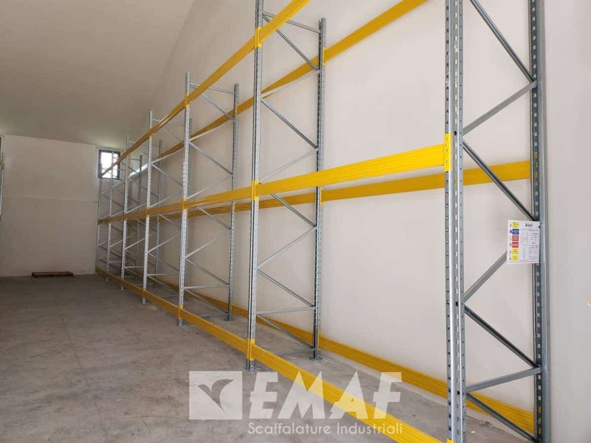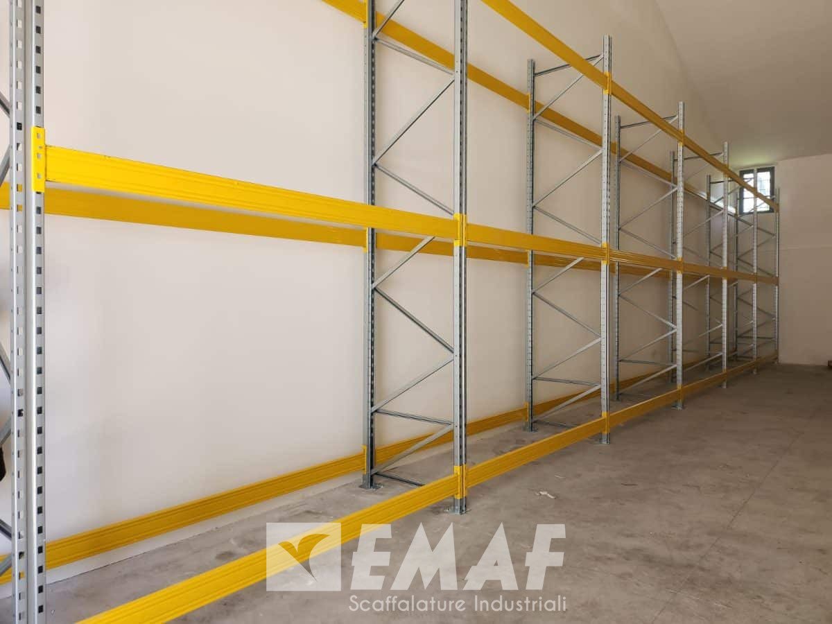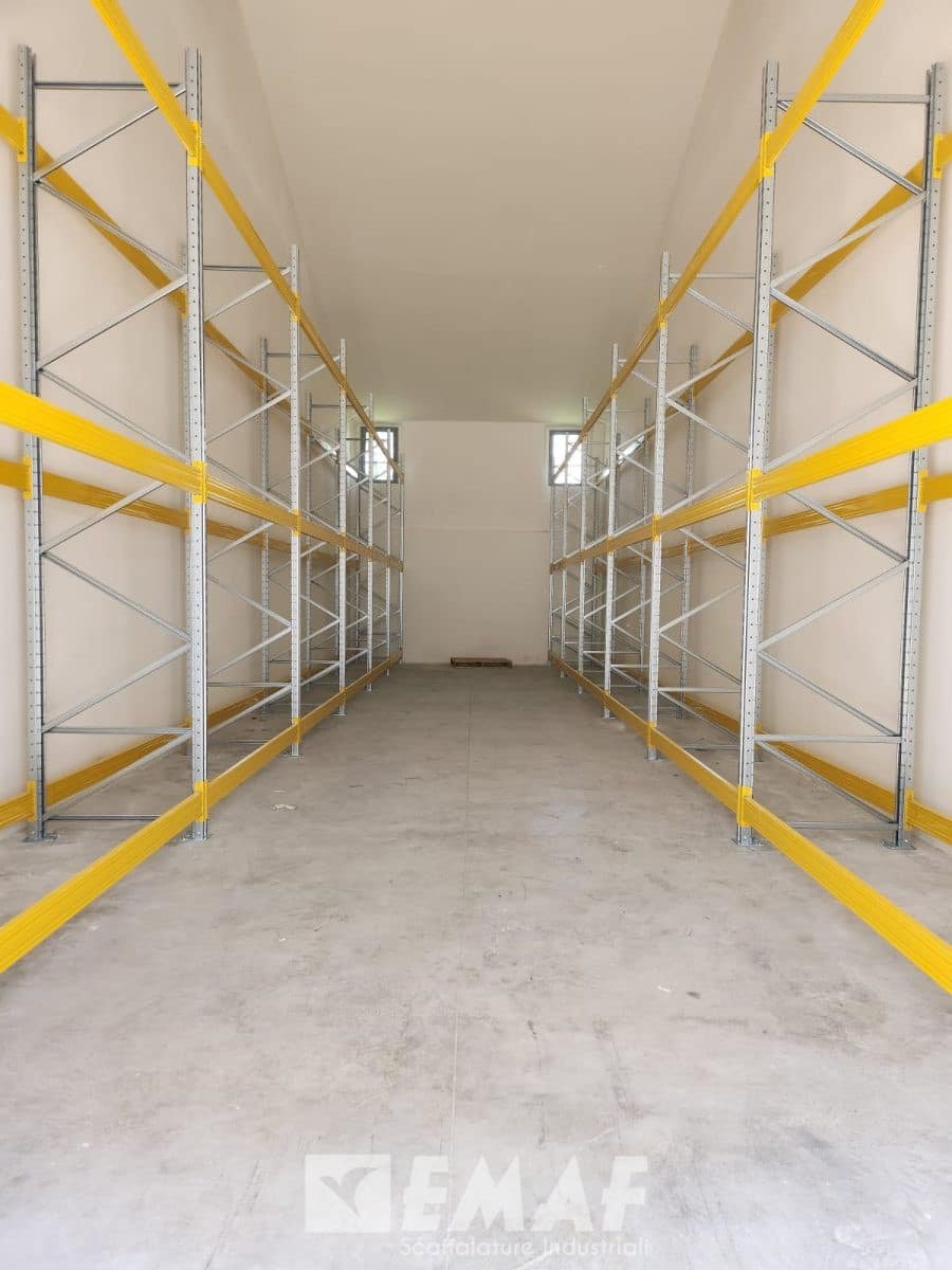 Sono state montate due file gemelle di portapallet Giotto H 4500 x 1000. Ognuna comprende sei campate da 2700 mm con tre livelli portata 3000 kg.