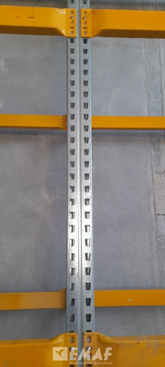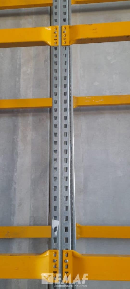 10 spalle molto slanciate, H 7300 x 950 mm, per realizzare 2 scaffalature gemelle da 10,50 mt circa l’una, con 3 livelli + terra, per un totale di 48 posti pallet ciascuna.