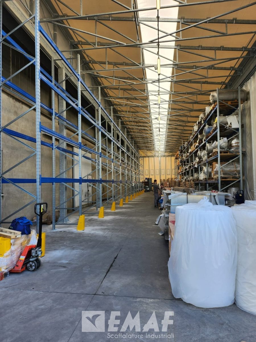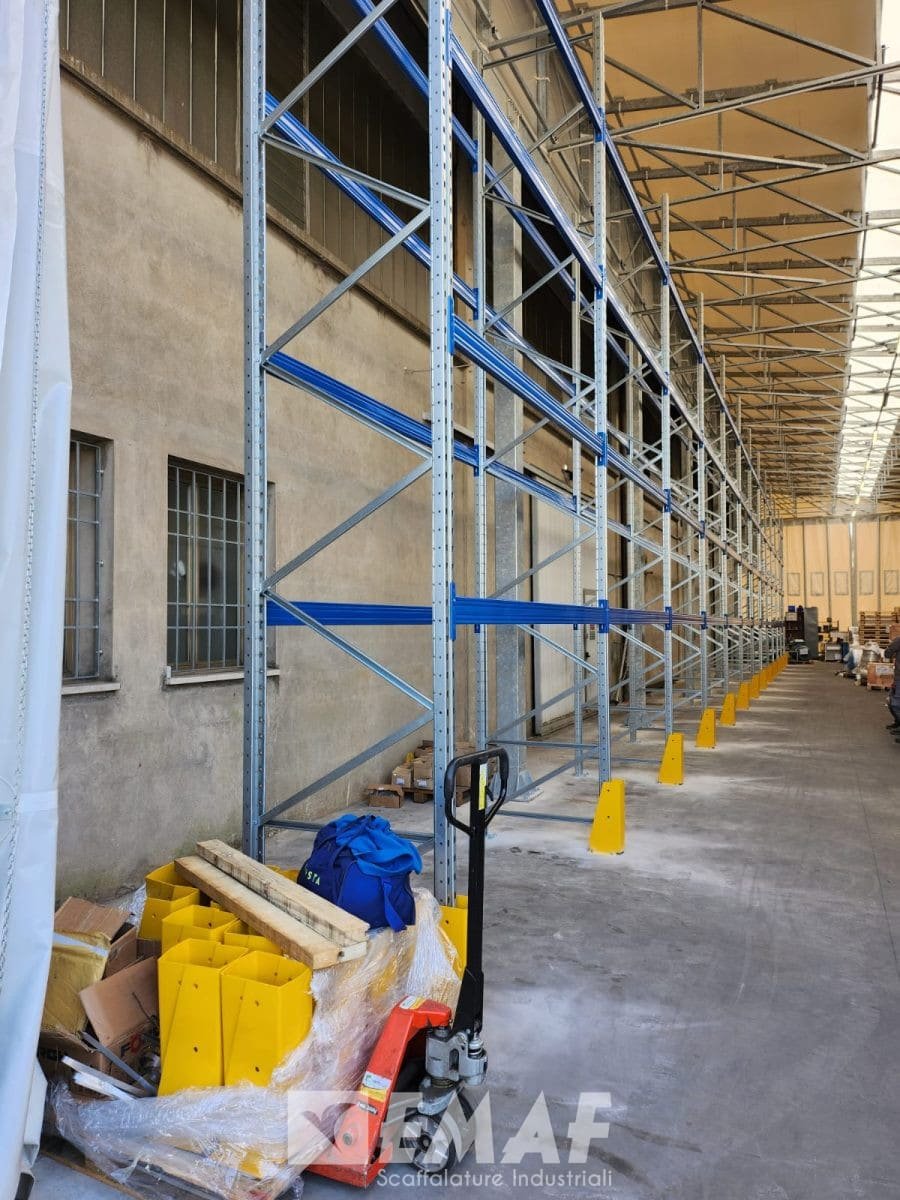Si tratta dell’installazione parziale di un intervento che prevedrà in tutto quaranta spalle alte 6000 mm e 280 correnti da 2700 mm, per un totale di circa quattrocento posti pallet del peso di circa 750 kg cadauno.