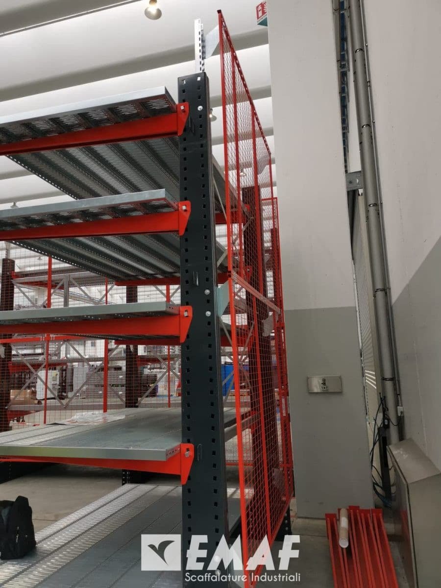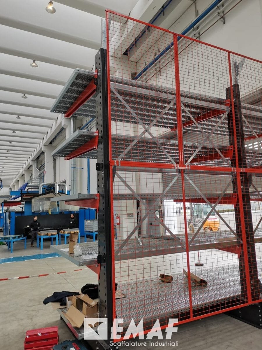 Nel dettaglio, sono state fornite e installate strutture Cantilever di dimensioni H 4000 mm con mensole di lunghezza L 1700 mm. Questi Cantilever sono state accuratamente progettati per soddisfare le specifiche esigenze del cliente, includendo un alloggiamento per piano continuo realizzato con doghe. Un ulteriore elemento che contribuisce alla sicurezza è stato integrato sul retro delle strutture: un sistema di reti anticaduta.