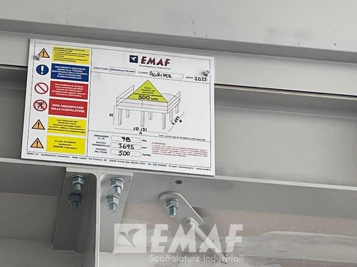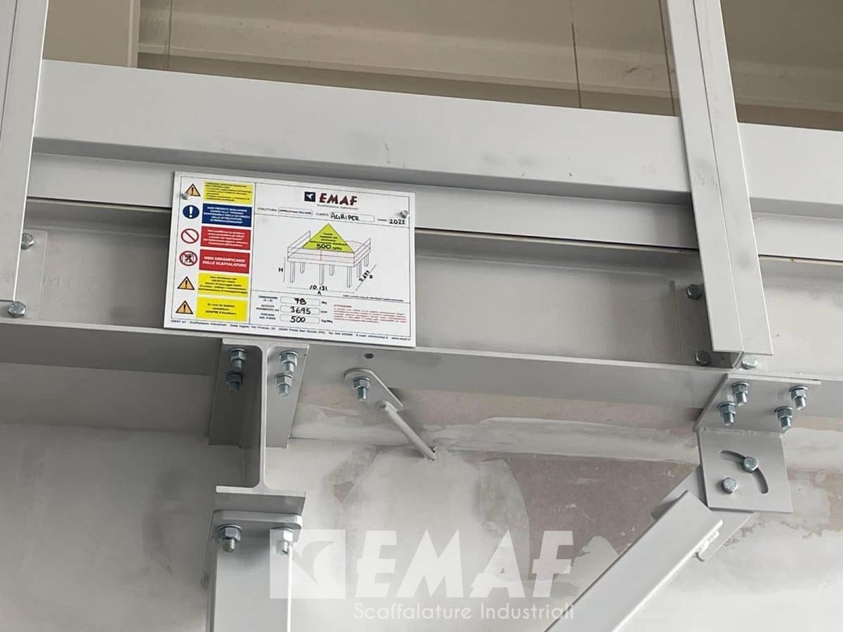 Il soppalco, che ha come dimensioni di 10,5 x 7,7 metri, vede un piano di calpestio in lamiera e mdf a 3,7 metri d’altezza, con una portata di 500 kg al metro quadro.