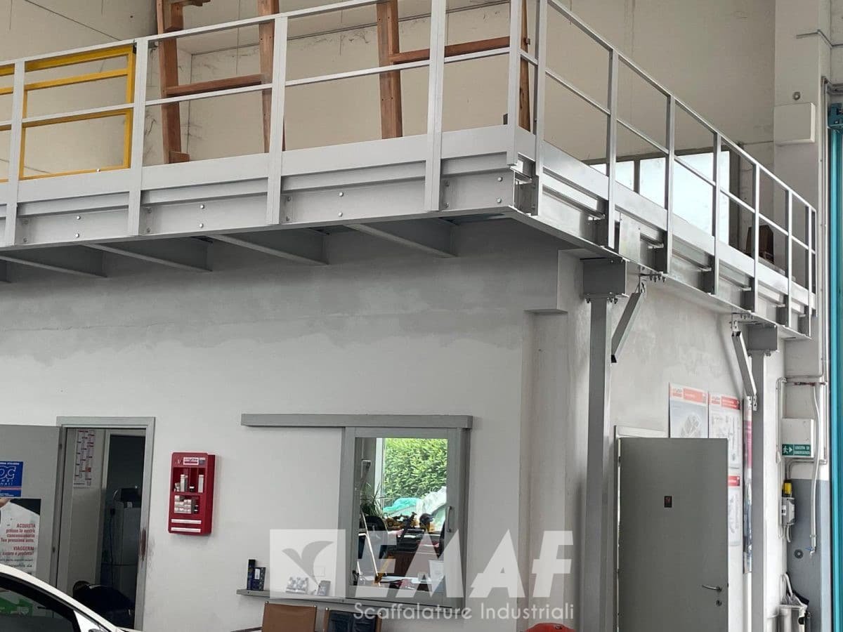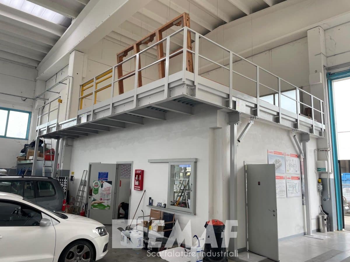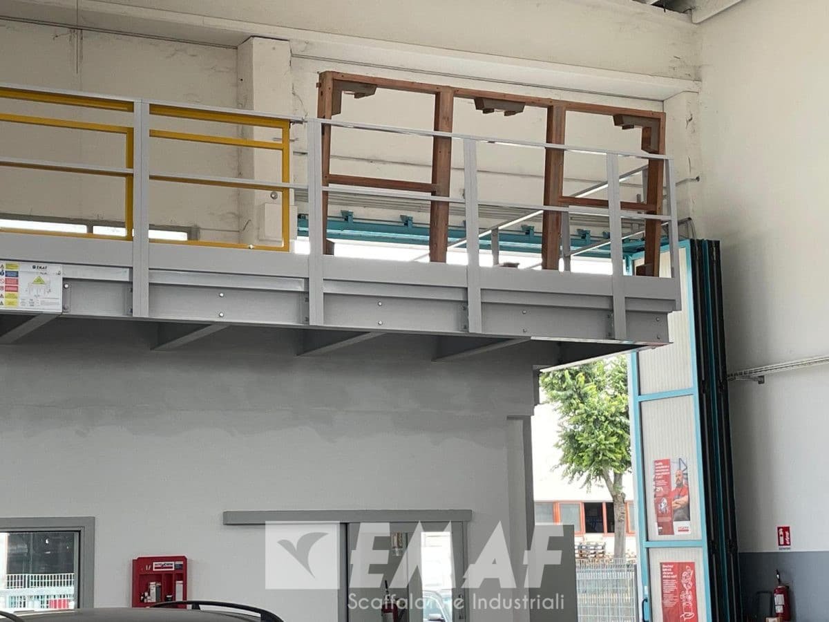 Due lati sono affiancati alle pareti e due lati sono con parapetto, uno di questi anche con cancello. L’impianto è stato progettato per soppalcare degli uffici già esistenti, con un lato a sbalzo per comodità del cliente.