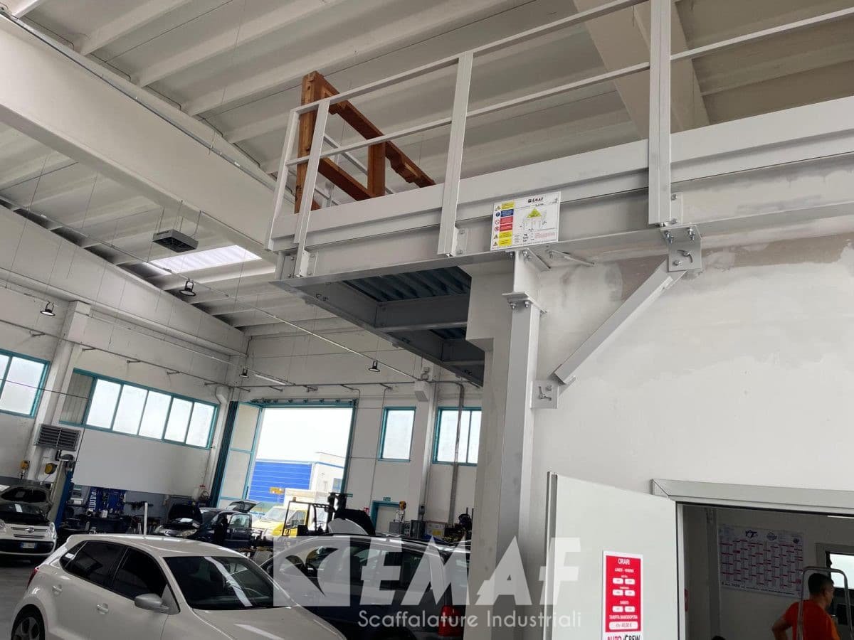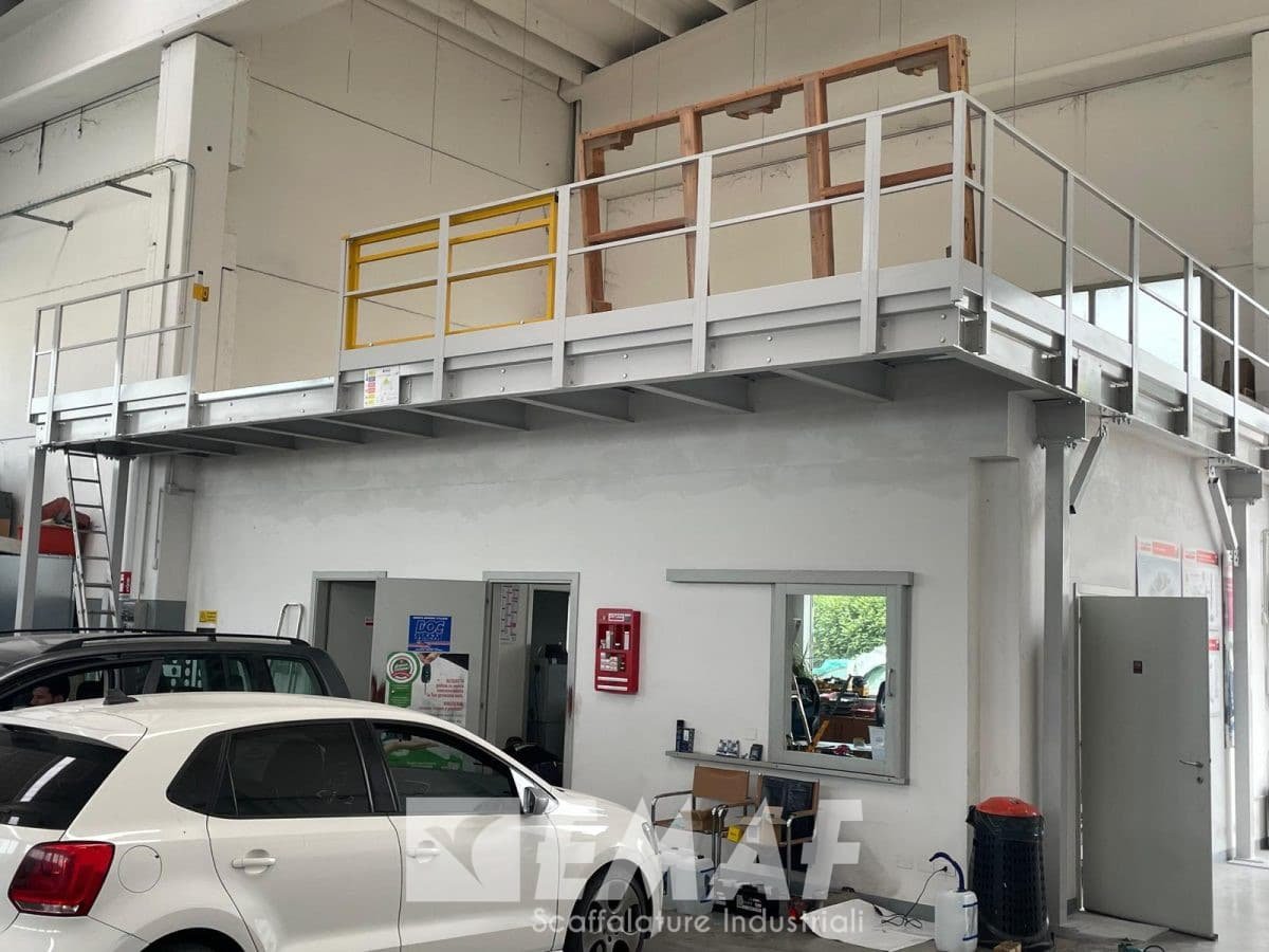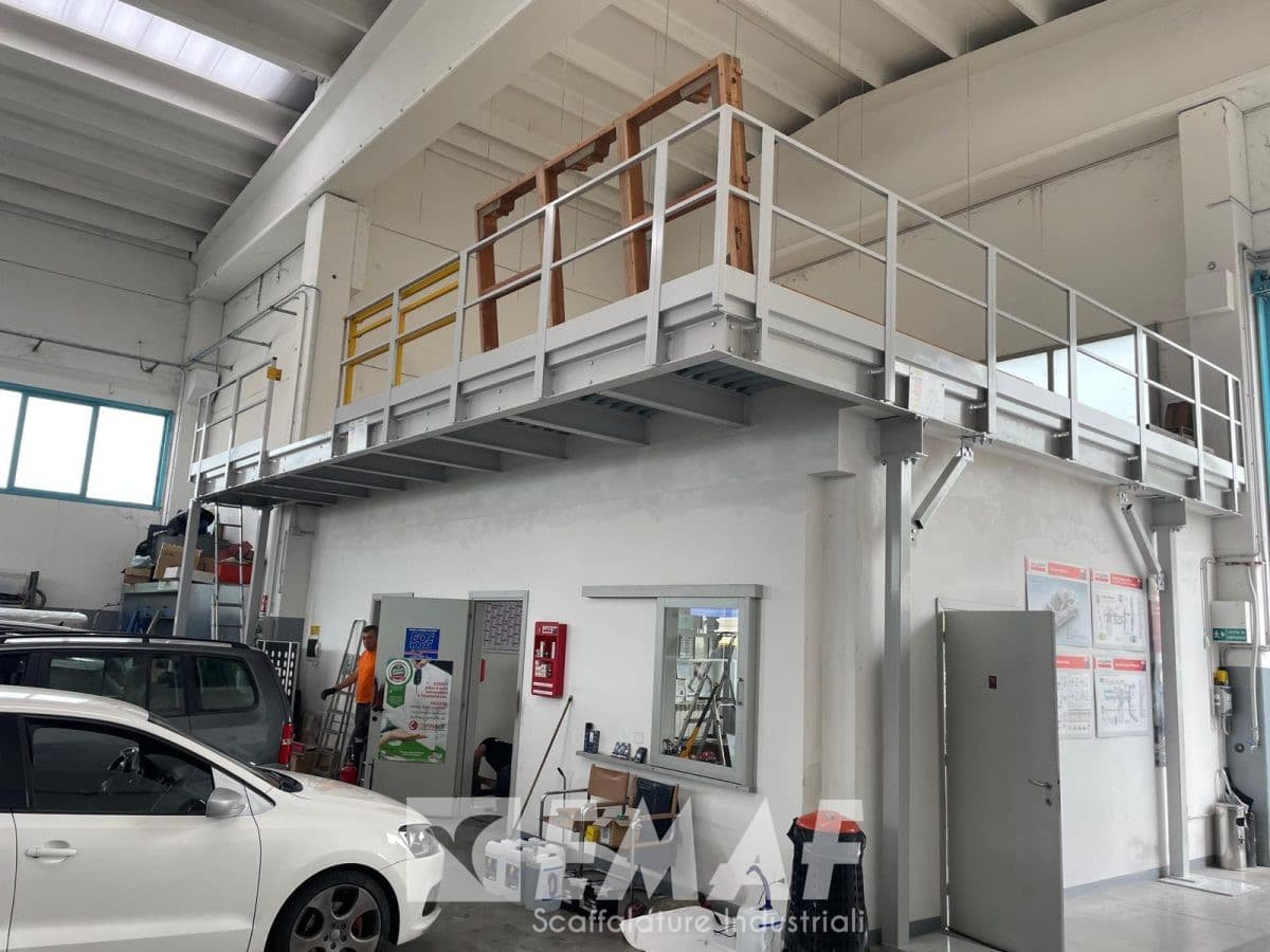 Due lati sono affiancati alle pareti e due lati sono con parapetto, uno di questi anche con cancello. L’impianto è stato progettato per soppalcare degli uffici già esistenti, con un lato a sbalzo per comodità del cliente.