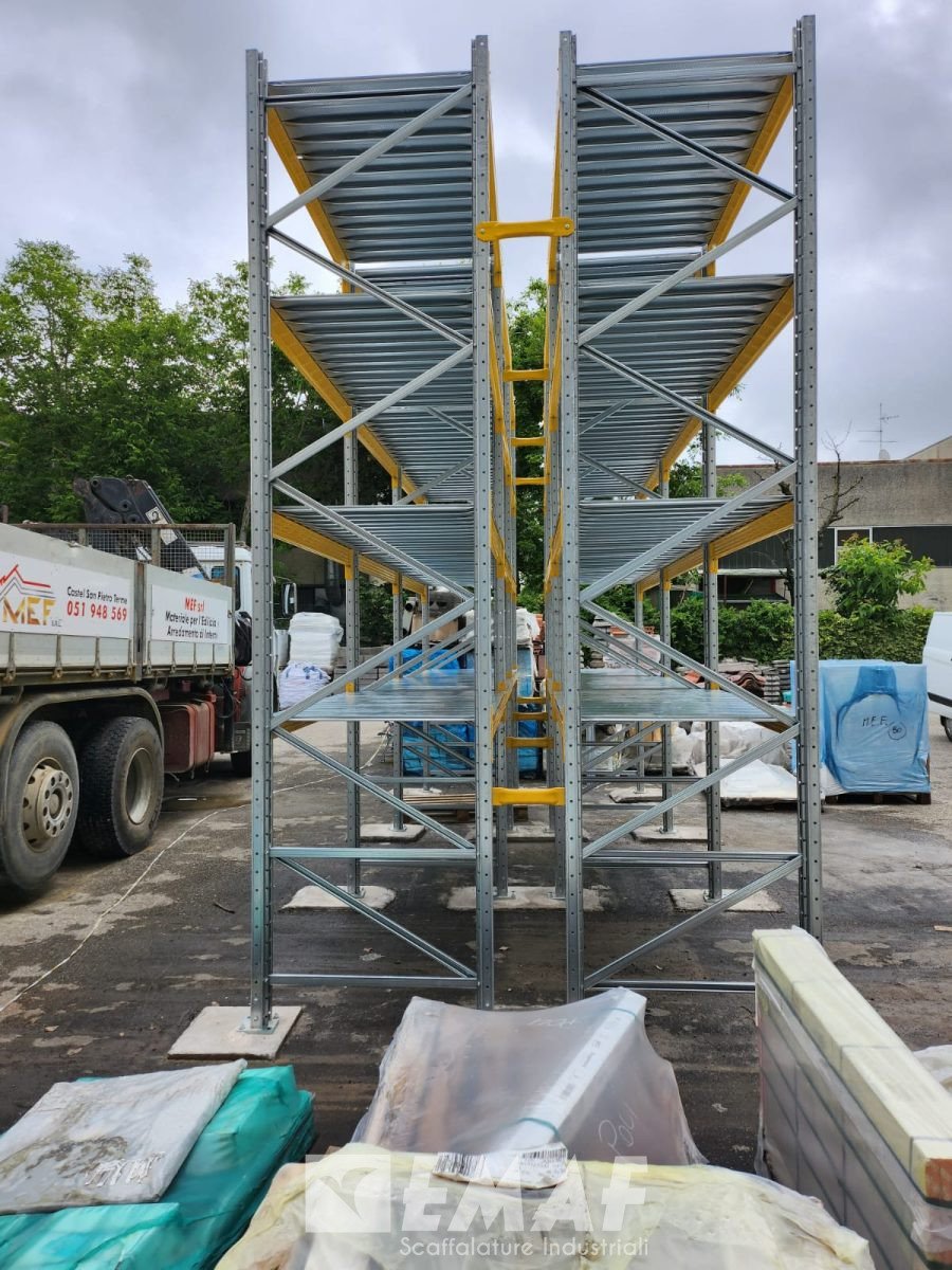 Le spalle sono alte 4000 mm, per quattro livelli più terra. Ogni ripiano misura 1800 mm, ha una portata di 3000 kg cud ed è stato munito di pianetti zincati. La capacità è di 60 posti pallet da 1500 kg l’uno. Il fissaggio è stato potenziato con piastre base rinforzate, barre filettate e cartuccia chimica.