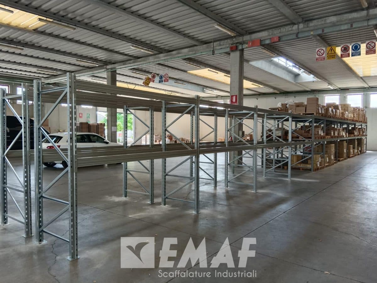 Abbiamo fornito tredici spalle alte 2500 x 1000 mm, trentasei correnti da 2700 mm e quattro correnti da 1800 mm, per realizzare così svariate campate da due livelli + terra secondo la disposizione decisa dal cliente. I montanti sono zincati e i correnti sono verniciati in Grigio Ral 7037.