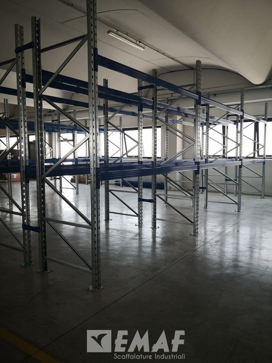 La scaffalatura metallica industriale portapallet, E.M. 100 modello Giotto, offre ben 162 posti pallet Epal distribuiti in due livelli più terra. Le spalle sono alte 3200 mm x 1000 mm, il piano è lungo 2700 mm e largo 1000 mm, per una portata per piano di 1900 kg cud.