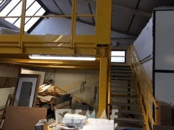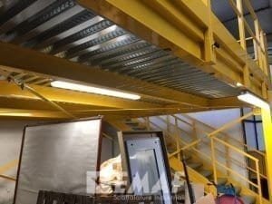 Il soppalco, completo di scala e parapetto ed in lucente colore giallo, permette fin da subito di “duplicare” gli spazi ottimizzando l’area del capannone.