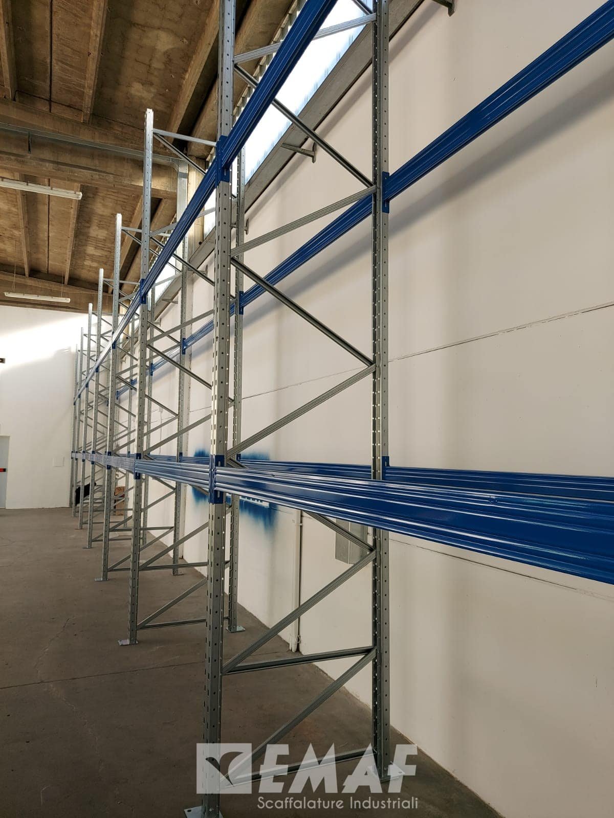 Il portapallet è composto da una sola fila, formata da sette campate alte 5000 mm, profonde 1000 mm e lunghe 2700 mm. L’impianto di scaffalatura metallica portapallet occupa un ingombro di 20 metri lineari, e ha una capacità di stoccaggio di 63 posti Epal.